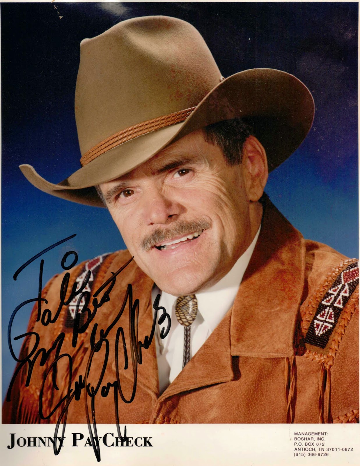 I was looking through some old photographs and found several autographed items. I remember when I saw Johnny Paycheck in person when he was singing at the Paint Valley Jamboree in Bainbridge, Ohio many years ago. I got him to autograph this photo outside at his tour bus after waiting a short time in line.
